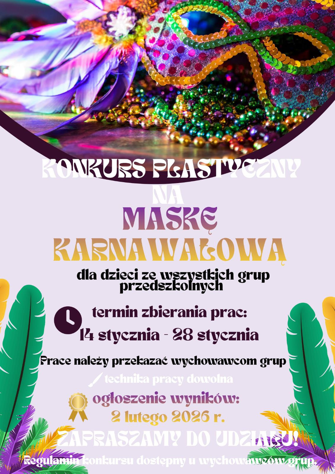 13.01.2026 22:07.Serdecznie zapraszamy do wzięcia udziału w konkursie plastycznym na Maskę Karnawałową. Maski wykonane samodzielnie , ewentualnie z pomocą dorosłego w kwestiach technicznych. Konkurs trwa od 14.01 do 28.01, technika dowolna.